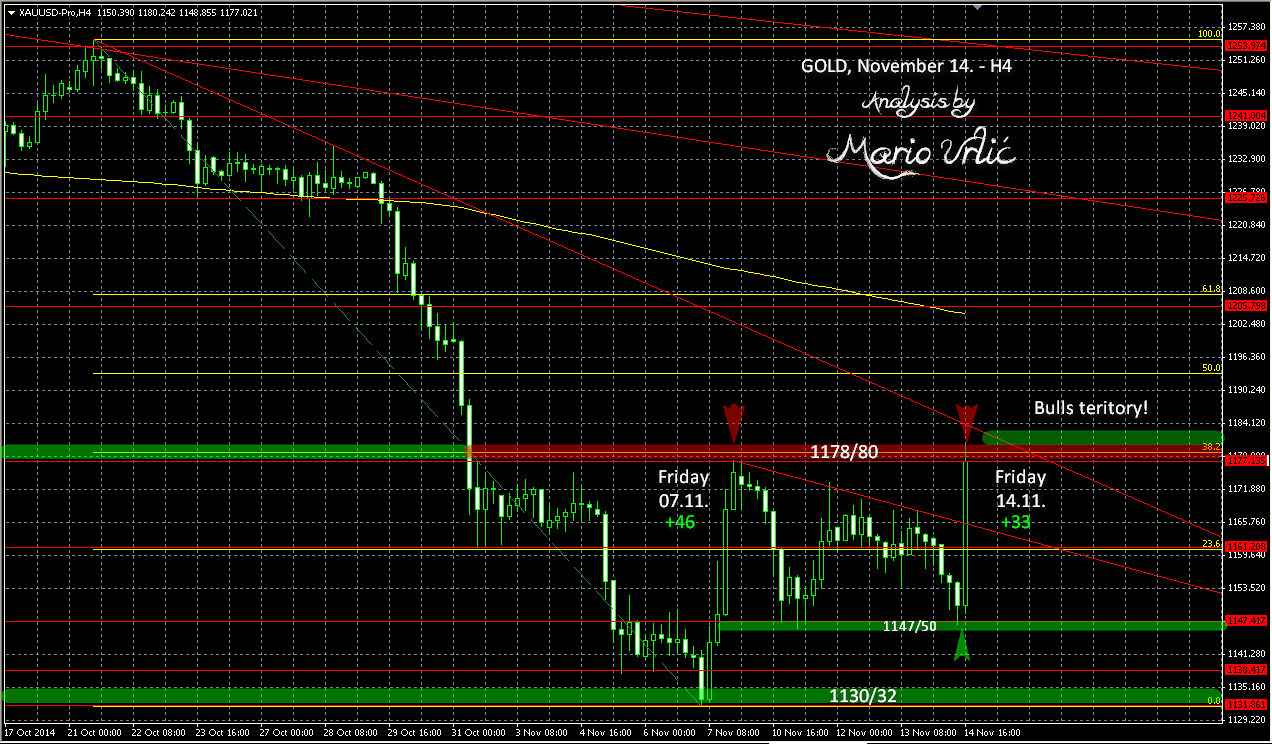 Last friday gold was sharply rebounded from the 4 year low level, and if that was ‘sharp’ how can we call this rebound today? Rocketed!? I was pointed earlyer today on my gold analysis that 1147/50 could be a minor support, but that level today has become a ‘lounch ramp’. What now? Gold hit strong weekly resistance with 1180 high of the day. It was not surprise that gold will be stopped here again and on my oppinion, there is no easy way for gold to brake that resistance now, but everything is possible. If bulls manage to do that, they could reach their territory. USD profit tanking at the end of the week is not surprise for me, but strong like that I didn’t expect today. I thought this move will hapen before two days, when gold has a perfect setup for the move like this. I predict and anounce this move on my analysis at November 12.