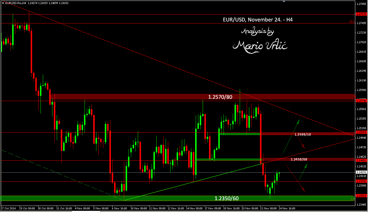 As I predict the possible movement on my EUR/USD analysis from November 21., the pair touched last night the support line at 1.2350/60, previous two years low and rebounded today to the 1.2430 level. At 1.2450/60 we have minor resistance, but it could be hard to brake, because of the trendline and resistance level. Stronger resistance wait at 1.2485/1.2500. On the way down, the pair have minor support at 1.2400, stronger at 1.2350/60 again, but is seams like the pair will not retest that level today, not for now.