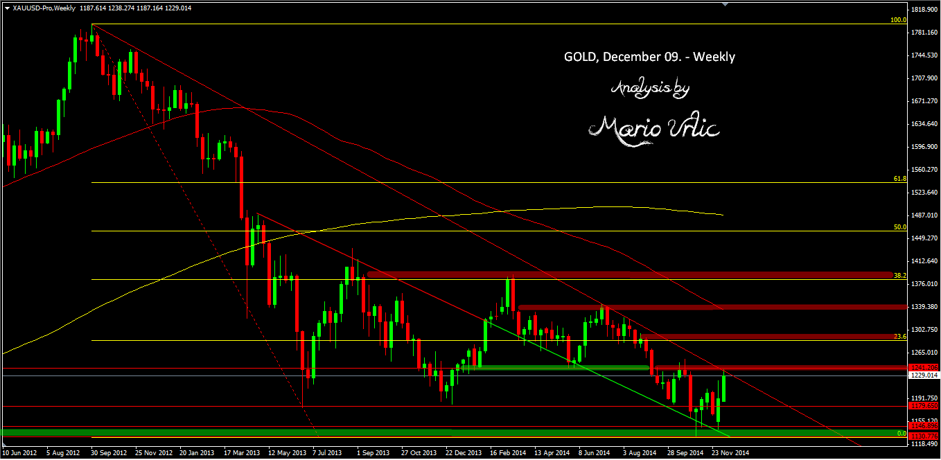 Let’s take a look what do have on weekly chart at gold? After the Swiss gold referendum results, the gold opened last week with decline to the strong support at 1246/48 and rocketed on the same day up, all the way to the 1221 high. The rest of the week gold moves from 1215 and 1286, trying to consolidate and close the week at 1191. Gold opened this week at 1187 and start to rise from the same level, catching 1238 high today. As we can see at this chart, that level between 1240/50 is previous support/resistance level and what more important is, there is a very strong weekly down trendline now. What do we have more here? Daily MA100 at 1237, then 50% fibo return from the July 10. –> November 07. fall at 1238… Do we need something more? I think that’s enough for serious test. Well, the bulls have a lot to do now if they want to push gold higher to the next resistances. 1240/50 is the first real step on the way to the recovery. What do you think traders?