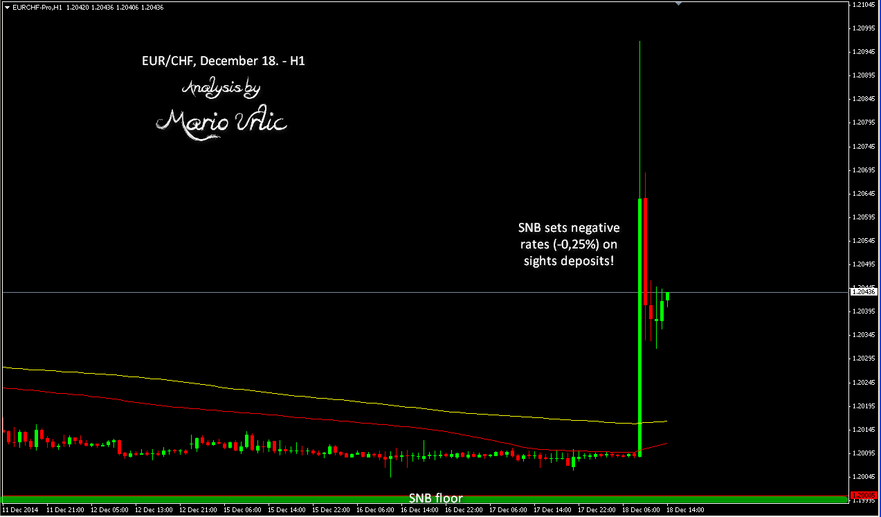 I wrote before two days, that SNB’s peg is in danger and that SNB must be on alert! Whell, SNB defended the peg today by cuting rates at negative (-0,25%). The pair is literally jumped 90 pips in 10 minutes, but I didn’t want to write anything before it’s settles down. Celebration didn’t last long and the pair is pulled back to 1.2030 an hour latter. What next and is that enough for SNB to keep the pair higher from the floor? SNB’s Jordan says that they had to intervene in FX markets in last few days and that SNB is ready to take more measures if required. Hm, I hope that’s enough for the market players, but be aware of the possible monetary policy change as well? Euro still looking bearish all over the market and we can see, that there is no enough streght here at EUR/CHF for now. But, let’s wait for a while and see what will happen next. 1.2100 could be the first resistance, 1.2130 and 1.2180 next, if the pair manage to bounce up again!? If euro can’t bounce again, the peg/floor will be in danger.