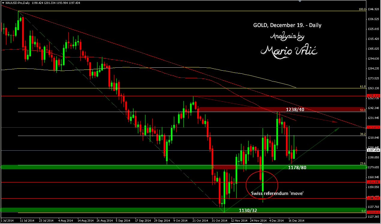 This is the 4th day in a row that gold is stuck around 1197 level!? Swiss referendum move disrupted the technical analysis and it’s not possible to adjust the up trendline properly. All I can see now is 1178/80 support level on the way down, stronger at 1148—>1130/32. On the way up, first resistance lies at 1210, following 1220 —>1238/40. US dollar is bullish all over the market, but the gold is still steady at this level. This is it guys, I am closing the book for this week, it’s Christmas time and Santa Claus is coming to town soon. 😉