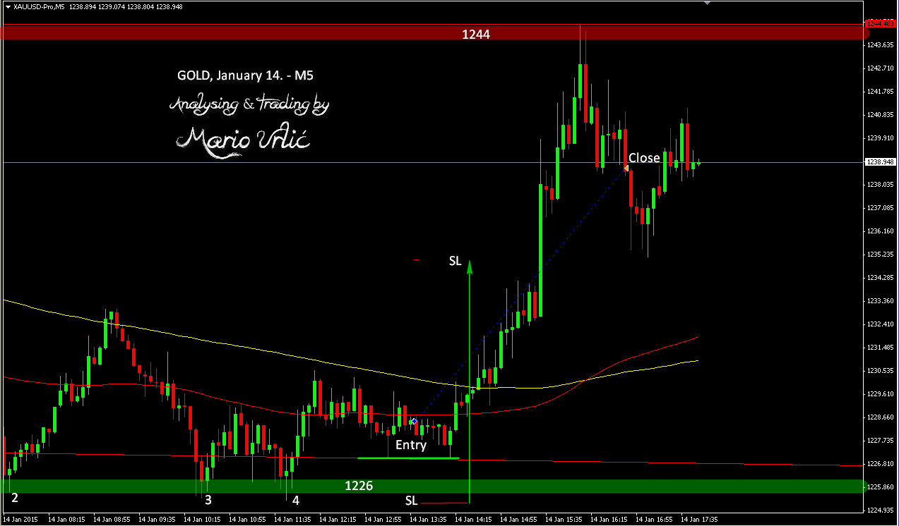 I traded gold today again and quickly took a 100 pips profit, here is how I did it. After the gold was well supported at 1226 for 4 times I decided to enter long at 1228.50 with SL near below previous 4 supports. Gold start to rise before US retail sales data and after the data gold growth accelarated to 1244. My target was higher at 1251 because I thought (that’s mistake) that bulls could brake yesterdays resistance at 1244. But, after I sow that resistance could not be broken easily and that US dollar start to recover all over the market, I decided to close my position at 1238.70 because I didn’t want to decrease more of my profit. This was nice trade, I hope you will find something useful to apply in your future trades.
