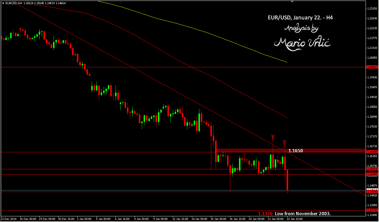 After the ECBs QE action, EUR/USD broke previous low from January 16. at 1.1459! Could the pair stop here or will continue to fall toward 1.1376, the low from November 2003.? The pair is looking extremely bearish at the moment, but bulls are fighting to defend this level. Interesting day for sure.