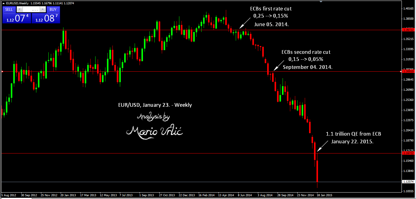How about EUR/USD? You can see that the pair was at the 1.3670 level during the first ECBs action, after wich the pair start to slide a few weeks latter, and until second ECBs move, the pair manage to get to the 1.3000 level. Second move was surprise for the market and the pair start to fall immediately, but the fall stoped at 1.2500 and recover for a while, after wich the fall continued furder and until end of the year, the pair catch 1.2100 and close the 2014. at the same level. In 2015. the pair didn’t stop to fall, and it was waiting for yesterdeys decision at 1.1650. After the yesterday ECBs 1.1 trillion QE decision, EUR/USD fell more then 500 pips, and catch new 12 years low, 1.1114! At the end, we can see that the measures of the European Central Bank had a strong impact on the weakening of the euro, in total of -26% verus US dollar. But, is this the end of the euro free fall? Not yet in my point of view!? While the ECB is lounching QE’s one after the other, we are waiting for FED to start with tightening monetary policy until end of the year. It will be an interesting year.