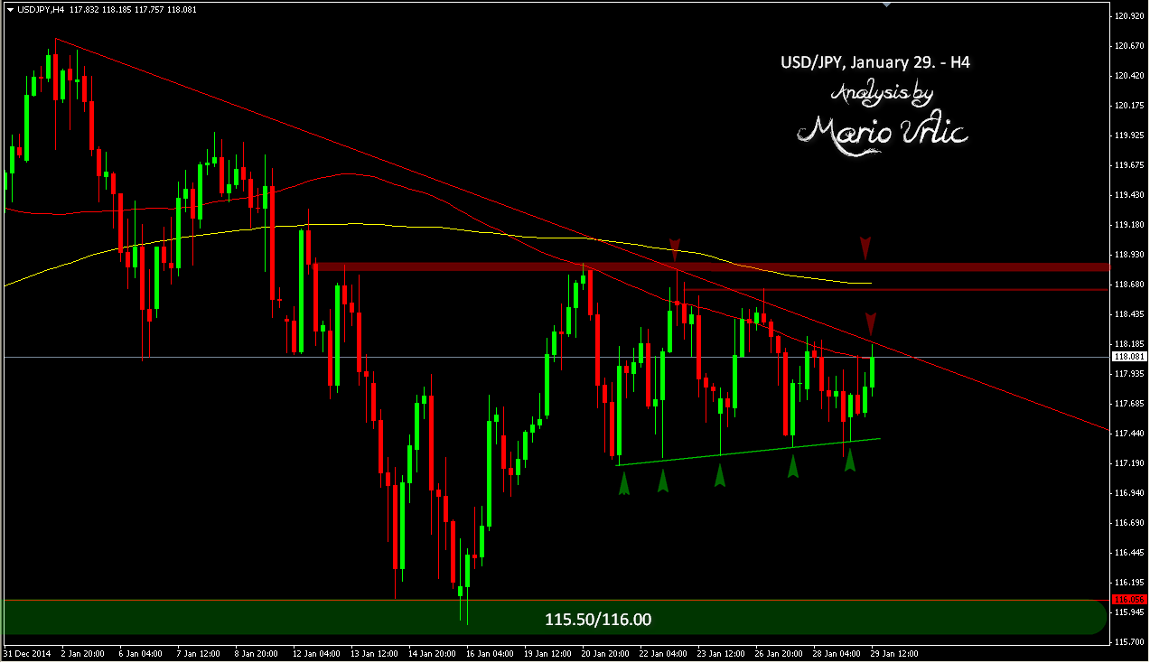 USD/JPY is bullish again today, but that’s not news any more. I was pointed few days ago at this ‘support trendline’ where the pair find buyers for 5 times allready and push the US dollar up every time. On the other side, down trendline holding the bulls on the way up and return the pair down again, forming some kind of the ‘roller coaster’ for days. What will be the solution here, down again!? Bulls target could be a resistant level at 118.70/90!