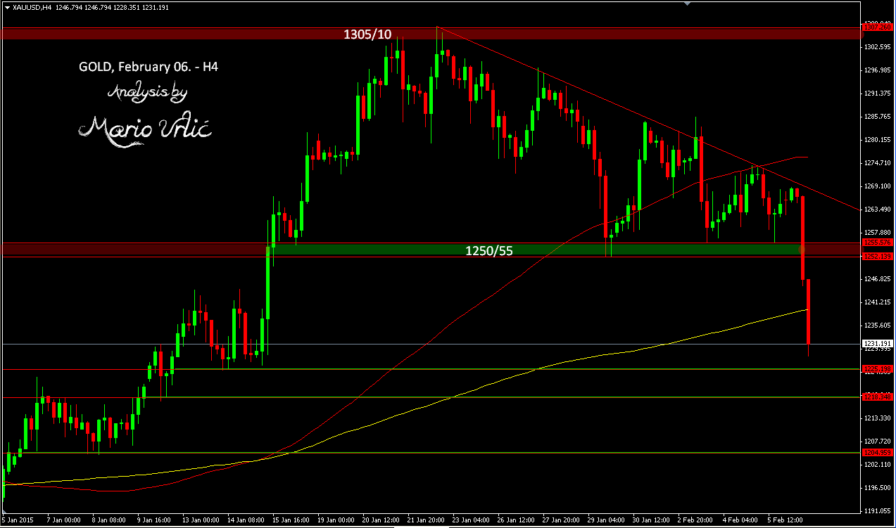 Gold bears finaly manage to brake 1250/55 support at the end of the week. I followed the employment data today and gold start to fall before the news, from 1265 to 1258! But, that’s not news on gold! After US employment data was out, gold tumbled furder down true the 1250/55 support and daily MA200, true the H4/MA200 at 1239 and until now reached the low at 1228.35! What next? There is a minor support at 1220/25, bellow that there is Dialy MA100 at 1216 and 1205/10 under could be stronger. Well, it’s the end of the week. Take care and enjoy your weekend traders! 😉