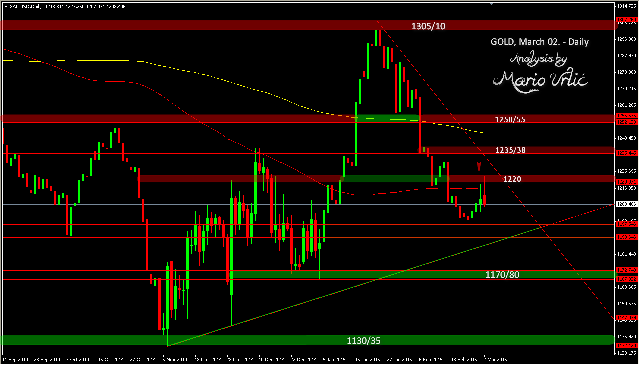 The third day in a row gold can’t manage daily MA100 and 1220 level. During the Asian sesion gold catch 1223, but Europe turn the gold down again and that’s not strange if you follow gold moves. US market continue to push down and gold is back in red at 1208 for now, probably aiming 1200 again? I wrote in my previous gold analysis that 1200 is magnetic for gold in these days, it’s looks like I was right, as I pointed at 1220 as an first resistnace as well. Let’s follow the next moves now, because here at 1208 is no major technical points and levels, I can’t find them, not until 1190/95. Do you see something?