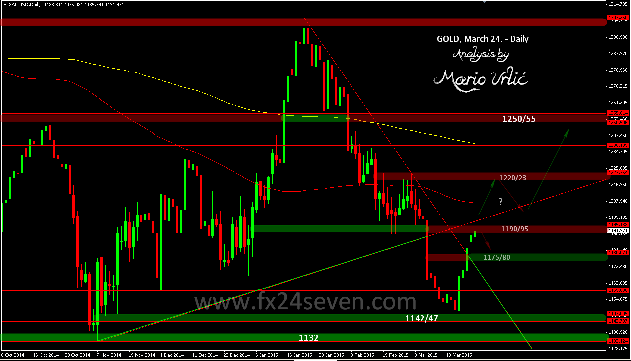 As I wrote in my previous gold analyis, the precious metal catch 1190/95 in the last two days and this is the level which is important to be broken. If gold bulls manage to get back inside the trendline, inverse H&S is possible here, with 1220/23 as an first target. This is not easy level to brake through and if gold retrets back, H1 up trendline is the first line of defense at 1187/88, lower we could have a solid support at 1175/80.