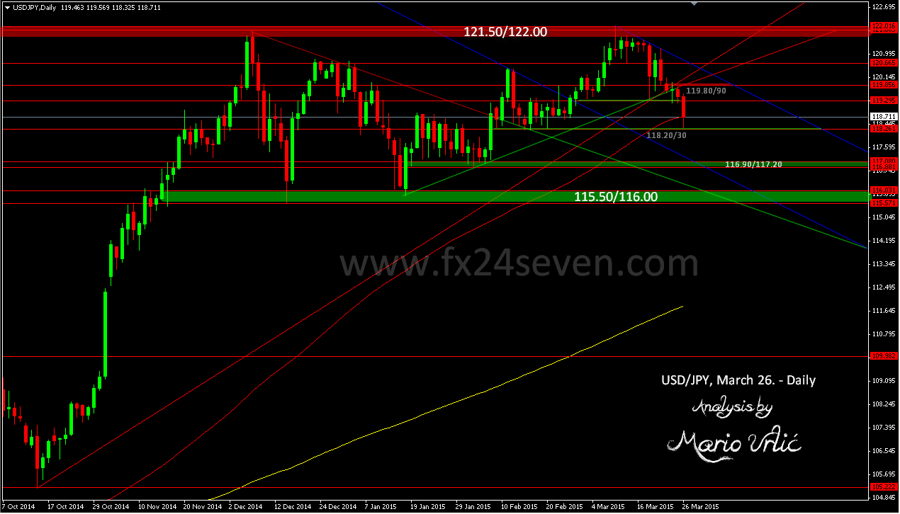 USD/JPY declined today to 118.32 low during the day, where the pair find strong support and buyers, which has returned the pair up to 119.00 at the time I am writing this analysis. As you can see in my analysis, 118.30 is previous strong support from February and that would not be easy to brake down. On the way up, first resistance lies at 119.20/30, stronger at 119.80/90! Daily MA100 is very important as well, placed today at 118.74! US dollar buyers stikes back on each stronger decline here.