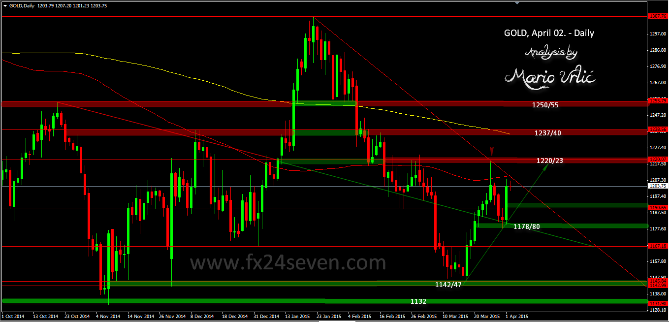 Gold is back with yesterday’s $28 gain, covering three falling days in a row. The low of 1180 had pushed the gold strongly up all the way to 1208, just near the trendline and daily MA100 at 1210. Today, the gold is slightly pulled back to 1202 at the moment and all I see here is first support at 1201 (H4 chart), 1190/95 could be next, the stronger one if 1201 breaks. Gold don’t look bullish today and I doubt that gould gold overtake daily MA100 and down trendline like this, but yesterday’s daily candle looks awesome and that could be the trigger for furder gain. Let’s see.