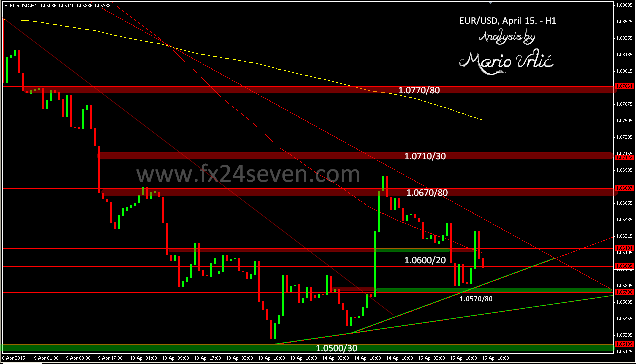 Today’s ECB press conference was interesting, but not by the statements of leaders, while the female protestant performance. But, what about euro and the most trading currencie pair EUR/USD? During the day in fear of Mr. Draghi, the pair fell sharply to the 1.0570/80 support, but when Draghi didn’t surprise the market and when he wasn’t so dovish during the talk, the pair recovered back to 1.0674. After the pair touched the previous resistance from yesterday, market players return it down again to 1.0570/80, where the pair has found the buyers again. Real roller coaster on the run for now, let’s see where will this wild ride ended today!?