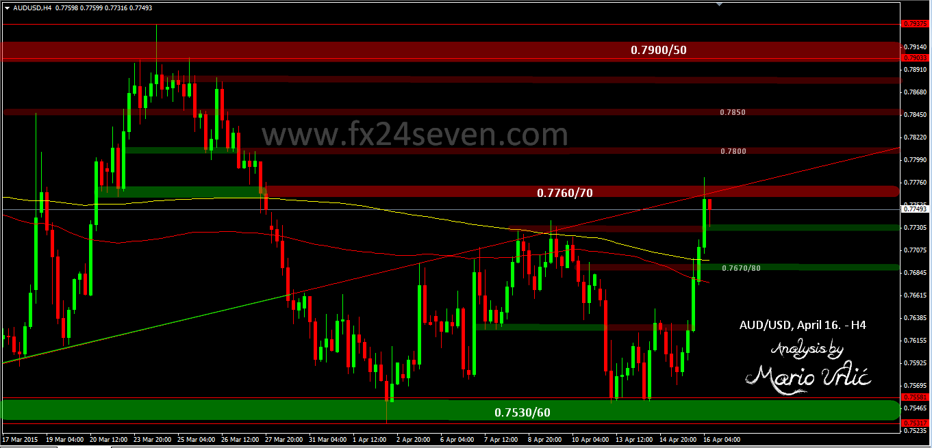 I hope that you remember my Aussie analysis from April 8., where I pointed at this trendline which holds Aussie on the way up for a long time now. In the last couple of days, the Aussie has tested support at 0.7530/60 for two times and the pair find a decent support at that level again, after wich has pushed strongly up in the last two days. The pair didn’t find stronger resistance on the way up, not until now, when trendline has been hit in combination with the resistance at 0.7760/70. You can see, that first support on the way back is placed at 0.7730, next the stronger one at 0.6770/80. Could Aussie finaly manage to brake true this trendline and open the way to 0.7900/50!?