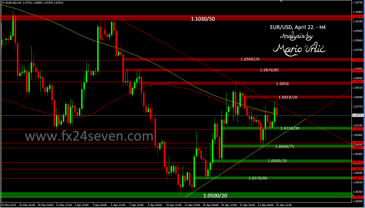 As I pointed yesterday in my EUR/USD analysis, the pair manage to brake true the 100&200 MA and touch 1.0800 today, the resistance level in combination with down trendline, which has push the pair back down true the 100&200 MA for now. Could these moving avarages hold the pair around that level or, the support at 1.0710/30 will be tested again? The market players are too nervous here at this pair and they can’t decide ehere to go, but technical analysis works just fine.