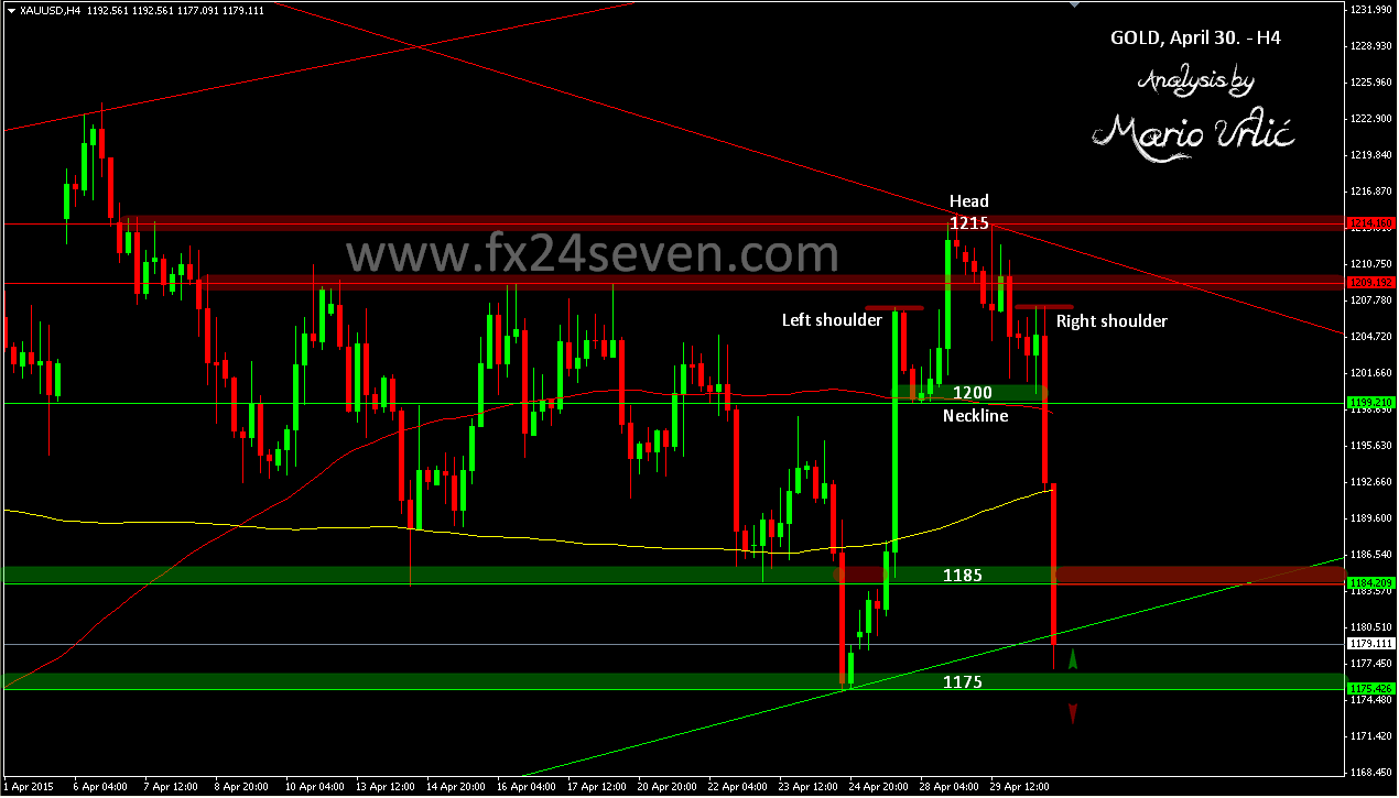 Gold traders have no mercy, but take a look at this beautiful and precise H4 H&S. 1175/77 could stop this fall and return gold up toward 1185, bellow 1175 could be more fall. Heavy selling today, 1200 was broken first, MA200 second, 1185 third, up trendline after… Wow, 1175 could be next as well!? USD/JPY is marching upward strongly too…This is third attack on the 1178/80 level, starting March 31./April 24./Today. This level could be defended again, let’s see!? Hard battle between bears and bulls! If gold recovers today, 1185 is the first resistance on the way up.