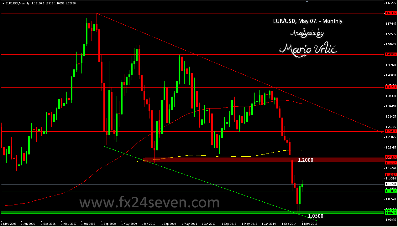 While the euro returns to collect the ‘forgotten stops’ under the 1.1280/300, let’s take a look at the EUR/USD Monthly chart. As you can see, 1.0500 stop the huge fall which has start in May 2014. I predicted that stop/return point in my analysis from March 11. After 10 months of the sharp falling, the pair finaly find the buyers and rebouded in March/April from 1.0500 to 1.1265 high. The pair closed the April at 1.1220. What do have in May? At the start of this month, the pair is still undecided where to go and there is no clear direction, even the euro is more bullish for now. If we take a look at support/resistance monthly levels, 1.1070/90 is the place for the buyers and 1.1520/40 for the sellers. Long term view shows that 1.2000 is possible strong resistance level for the pair and that could be the top 2015. level for the euro!? How do you see this traders?