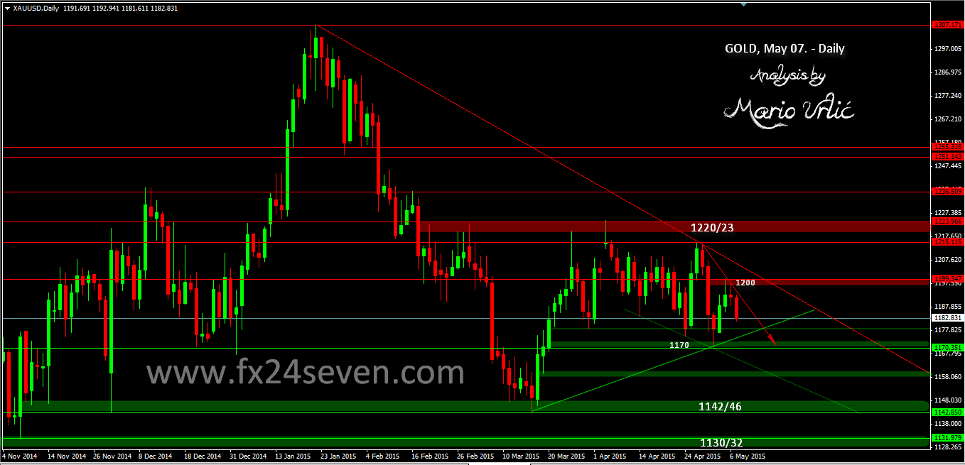 Gold headed back down again, after it didn’t manage to brake true the 1200 in the last two days. There is several technical supports now here between 1170/80, the question is could that level hold the sellers? US dollar is not favorable in the market, but gold can’t get benefit from that situation, which is a little unusual. If US dollar regeins its strenght, gold could fall strongly down toward 1140. In the meanwhile, watch this technical levels and follow the important datas from the US labor market, which follows today and tomorow. It looks to me that gold is strictly controled to remain at low price for a while!?