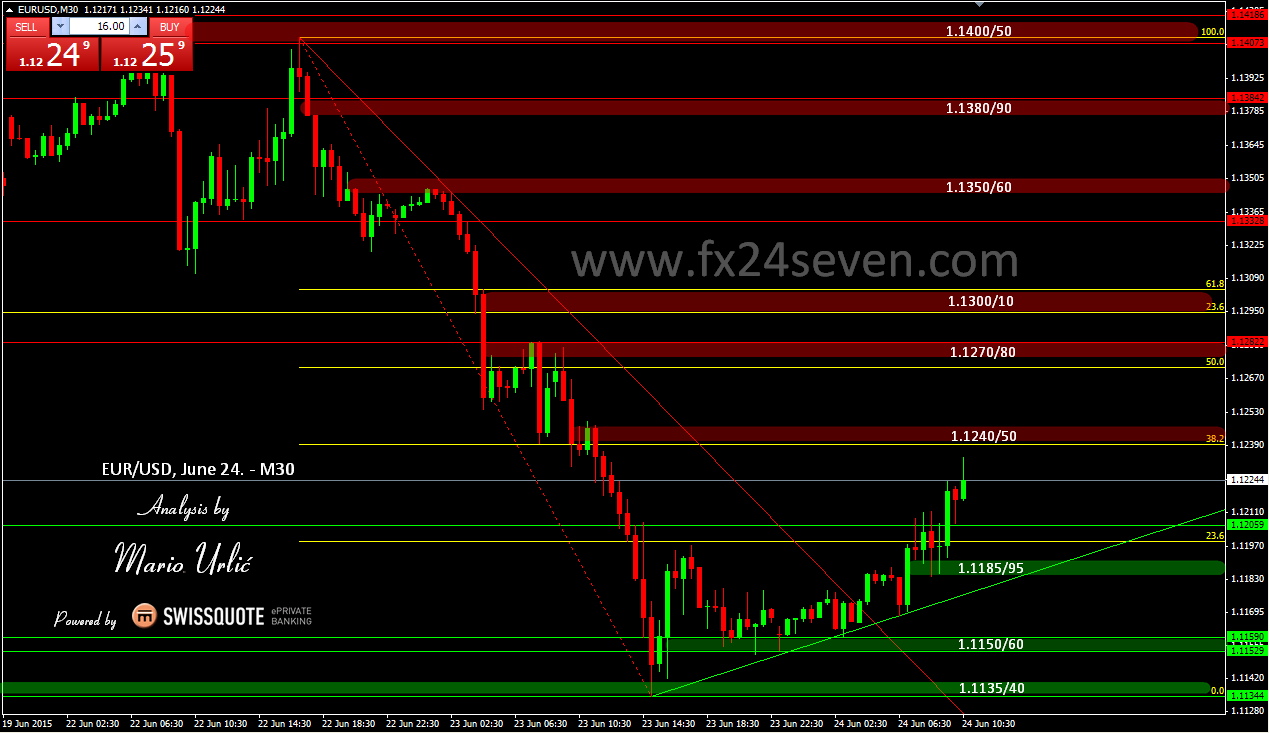The pair has recovered from the lows and reached 1.1234 high for now. I point this 1.1150/60 yesterday in my analysis as possible support and reverse point. You can see, that the pair has struggled with the 1.1200 level in the morning, but it manage to brake it and now is aiming to 38.2 fibo return of the yesterday’s sharp fall. 1.1240/50 is next level to watch and there is much more to come above. Yesterday’s fall was easy true the all support levels, MA’s, like there was no buyers at all, let’s see how will sellers react today. There is US GDP coming up today at 12:30 h (GMT), Greece is on the line as well, much important news for the market. Watch this levels and create your trading strategy base don technical levels, it’s always works. This will be the hard work for the bulls!