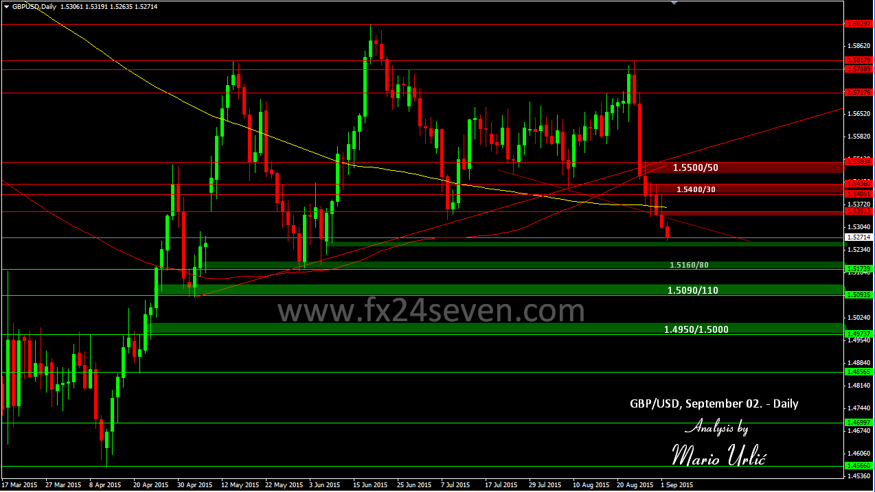 Trend lines, support levels, daily moving averages 100 & 200. Is there anything else? The Pound is falling for 7 days in a row, breaking all supports in front. Decline started from the level 1.5800, only one day after the bulls have manage to broke strong weekly resistance at 1.5650/700. The pair reached 1.5263 low for now, where is the minor support level, the pair could take a brake for a while. But the bears are aiming 1.5000 level for sure. Could they reach that? For now, targets for the bears are 1.5160 > 1.5100 > 1.5000. On the way up, 1.5300/50 is first resistance, MA200 is placed at 1.5365 for now, 1.5400 is the next stronger resistance. But, I don’t see any attempts for the possible recovery, the bulls have retreated to lower levels!?