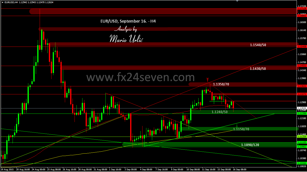 In my previous EUR/USD analysis from September 11. I pointed at this 1.1350/70 as an important for the bulls. The pair aproached ‘too easy’ on Monday at that level, after wich it wasn’t hard to hold the line for the bears. The euro bulls hold the first line at 1.1290/300 until Tuesday afternoon, after wich the bears reached the next line of defense at 1.1240/50. The bulls hold that line today for the second time but the pair don’t look bullish as you can see. Daily MA200 is placed near as well, at 1.1234 today and that could help the buyers, but the bears could search liquidity lower. Up trendline is placed at 1.1210, maybe that could be the turn point!? Well, tomorow is a very important day for US dollar, FED Interest Rate Decision, we could say the judgment day. It’s not easy to analyse the market day before important events like this one, all we can do is watch the big players and wait for the FED’s decision tomorow.