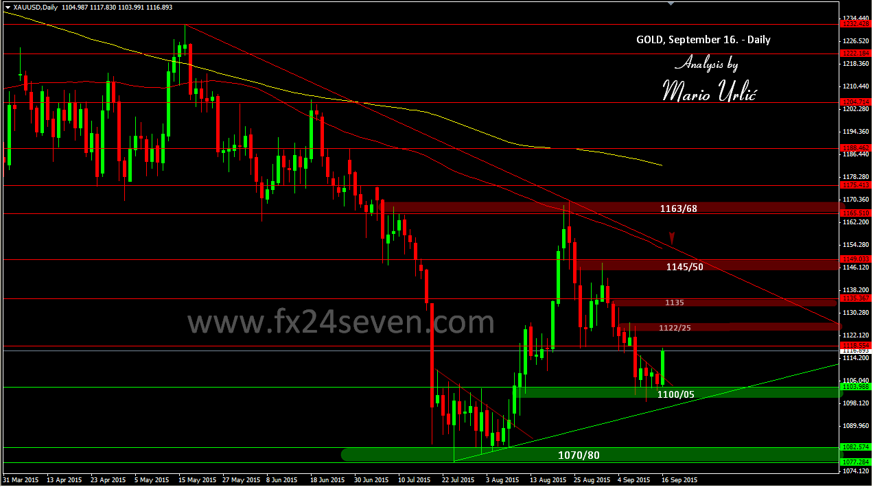 And, it seams that they don’t expect the rate hike tomorow!? The gold has finaly move from 1100 level, where the precious metal has find a decent buyers in the last 6 days. Started the day at 1104, the gold is reached high for now at 1118.60, the previous support from August and begining of September. It seams that that level could be broken today easy, with next target for the bulls at 1122/25. The last datas from the US is showing some ‘slow motion’ in the US economy and that was probably the trigger for this move up. Let’s see what the bulls can do and how will they react tomorow if FED stays at no change monetary policy. It could be the blast here, the 1145/50 could be attacked tomorow! How do you see this traders?