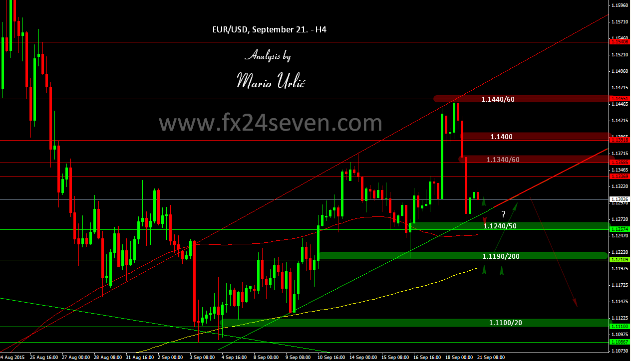 How else to describe a failed attempt to brake the 1.1440/60 on Friday? I was pointed at that level for several times last week, as an very important level for furder gain, but it seams that the sellers were more serious then the buyers. What interesting was on Friday, when everybody thinks that the week is over, the sellers broke 1.1340/50 support and the pair fell for almost 100 pips in the last hour of trading, with 1.1268 low. The trendline stoped the fall and despite the FED’s decision to leave the interest rates on hold, the EUR/USD ended the week in red. Well, I always said that there is no surprises in the market, it’s just the way it is. If you ask me, the fall on Friday is not so strange at all, because the FED’s decision was expected. What do we now? The pair is moving between H1 MA200 and 100, resistance sellers are placed from 1.1340/50 > 1.1400. The up trend line is important now, it’s the first support, but I doubt that it could hold another sellers attack. The 1.1240/50 is next minor support, 1.1200 could be the stronger one. Is this possible move for this week? How do you see it traders, up again toward 1.1400 or down to 1.1200? Maybe the buyers have just forgot some stops on the way up? Whatever the reason is, follow the technical levels.