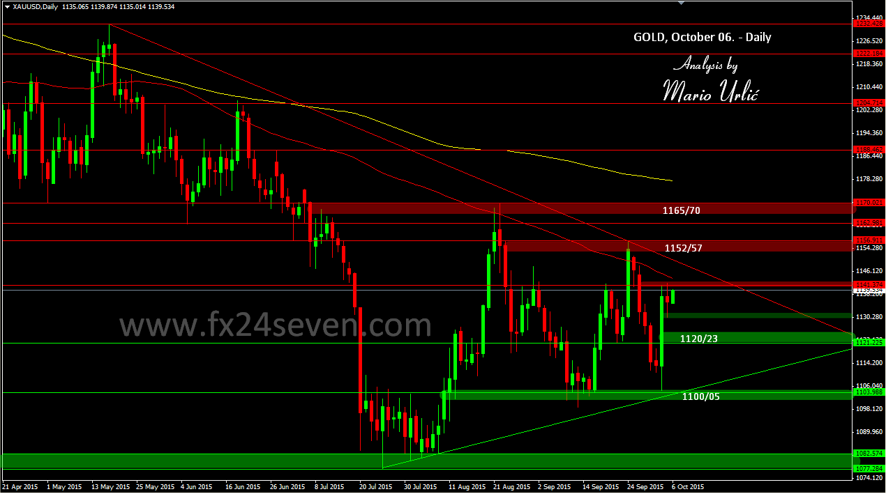 There is no rate hike from FED and the question is whether it will be in 2016. as well, but the gold is still shy. On the other hand, it keeps the gain from Friday after NFP. The gold jumped to 1140 and that is the resistance which I mentioned in my gold analysis from September 28. This is the third day in a row in wich gold can’t manage that level, but the gold remain bullish anyway. Daily MA100 was ‘the problem’ for the bulls in the last three attacks as well and the line is placed today at 1143.80. Down trendline is now at 1149.50, after wich comes the reistance at 1152/57. On the way back, there is minor support at 1130, the stroner one at 1120/23. There is not much important news until Thursday from the US market, maybe we could see more action then!?