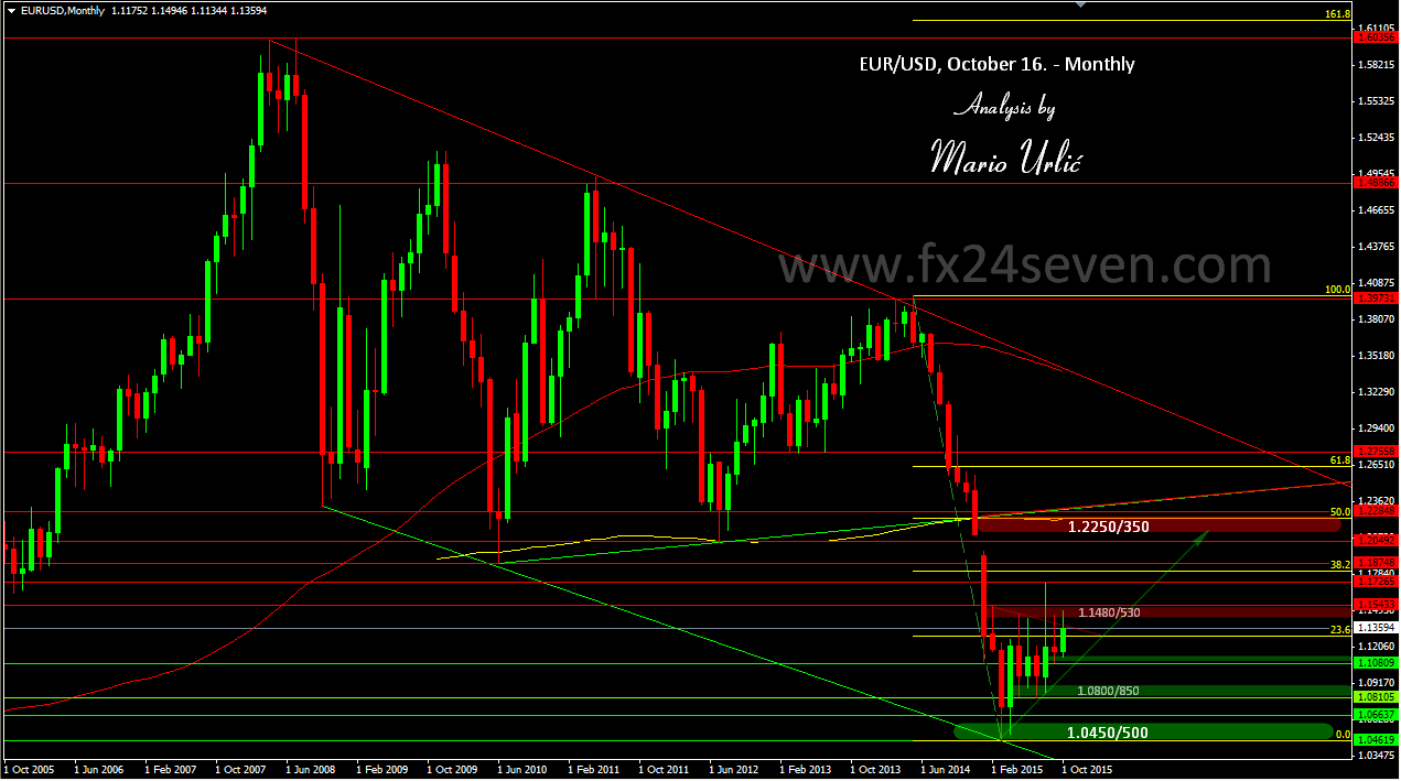 Let’s take a look at monthly chart and what do we have in 2015. so far!? The pair open the 2015. with 170 pips gap at 1.1936, after wich has slided to 1.0500 until March, where the lower channel trendline stoped the fall. If you can remember, I predicted that level as strong support and possible turnover here in my analysis at March 11. After that, the pair rebounded up in April and reached 23.6 fibo return of the 1.3993 > 1.0460 fall, with high of 1.1265. In the next 6 months until today, the pair is moving between 1.0800 and 1.1480, except August and this 1.1720 fail weekly and monthly brake of the resistance area. What next? Could wee see a 1.20 in 2015.? Well, if we take a look at this monthly chart and analysis, the pair loook a slightly bullish, but that scenario is possible only if the pair manage to brake and close the month above 1.1550, which could become a strong support in that case. Sure, there is several resistance areas after that and this scenario looks optimistic in this point. If the pair fail to break this monthly resistance area, a number of failed attempts can have the opposite effect, the bears could take a control and pushed the pair back to 1.0500. It’s the middle of October, there is two and a half months until the end of the year, everything is possible. Keep following lower time frames for short term trading, but keep in mind these levels.