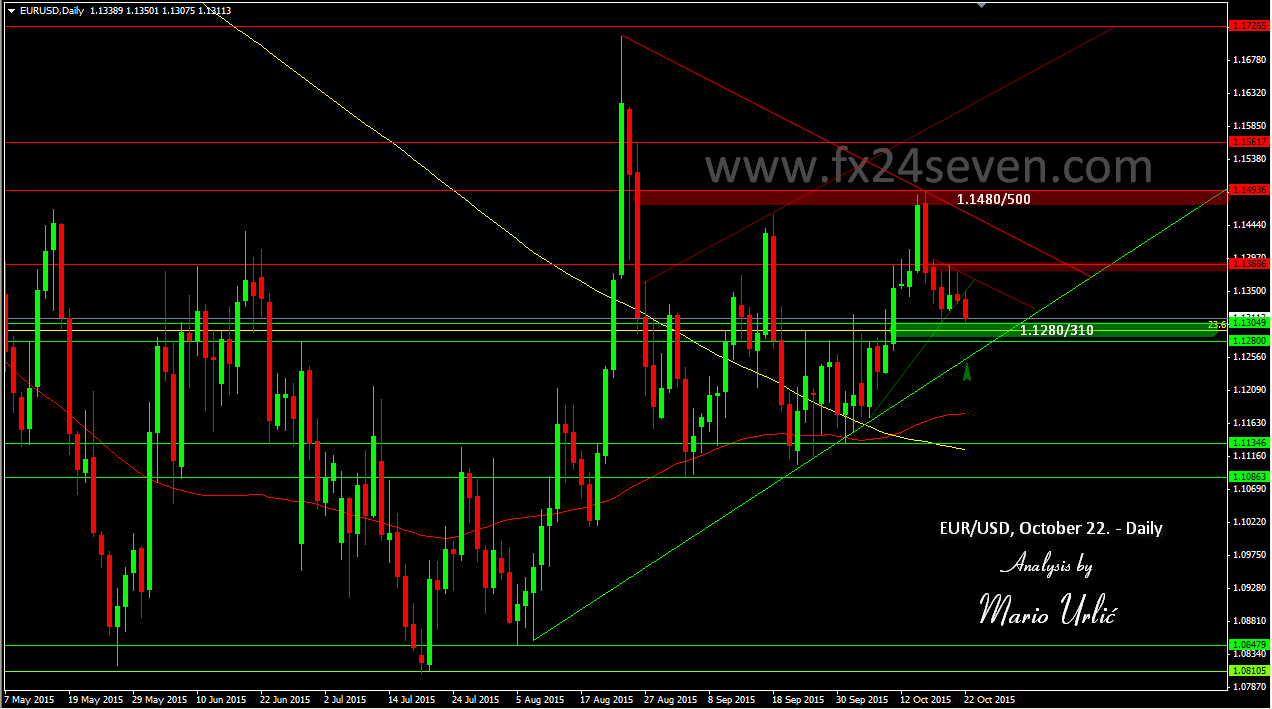 After the pair didn’t manage to break 1.1380 yesterday, all day was to calm with up trendline support at aprox 1.1335/40. During the Asian sesion, the pair slowly broke that trendline and the pair slided furder to the support in this morning. Looks bearish and the support could be in danger now, wich is not strange if we know that ECB and Mr.Draghi are coming today. If this support break, next station for the pair could be 1.1250/60, the up trendline wich has supported the pair at the end of September, begining of October. Bellow follows daily MA’s and 1.1080/100, the support which I pointed in my previous analysis. This support level at 1.1280/310 could turn out to be a double bottom as well, October 19. > today. If yesterday was to calm here, today we could see some action, thet’s for sure. On the way up, 1.1340 is the first resistance now, down trendline at 1.1365 is second, 1.1380/400 the strong one. We all know that Mr.Draghi mostly have a negative impact on the euro when he talks, that will be the real test during the press conference.