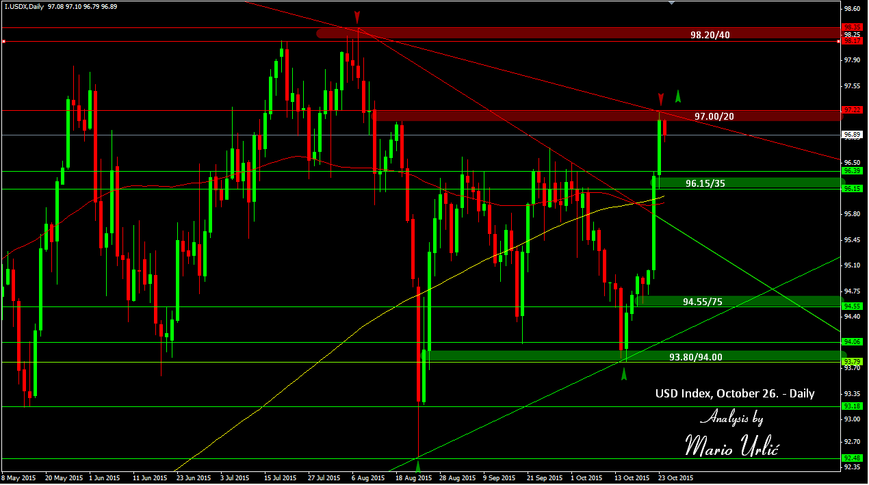 Strong week for the US dollar, the best in the last 5 months. At first, strong weekly trendline stop the fall and pushed the usd in the middle of October from 93.80/94.00, after wich the stong return was inevitable in the previous week after Mr.Draghi. In the previous week the index has broke all resistance areas easy in only two days and reach the strong weekly down trendline at 97.20. You can see how heavy the us dollar broke the MA’s on the way down in September and how easy on the way up in the last week. Well, that’s how the US dollar bulls are serios in 2015. They cover each decline strongly and hold the gain after for days. Take a look at this roller coaster from August. Amaizing isn’t it. Ok, this level at 97.00/20 is strong resistance now and eventual brake up could push the dollar even higher to 98.20. On the way back, stronger support is waiting at 96.15/35. Interesting return for sure.