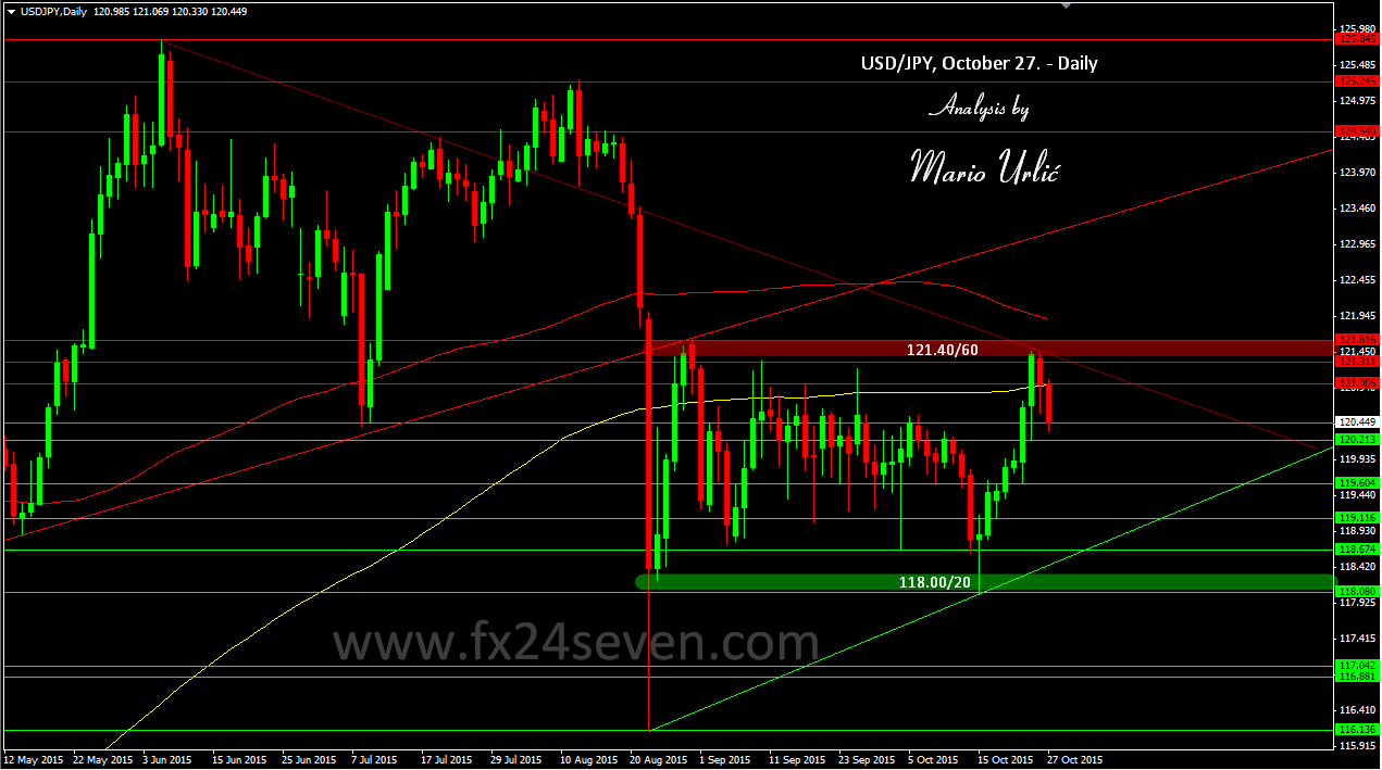 The US dollar has strengthened against the Japanese yen for 7 days in a row, but the sellers were ready at the 121.40/60 again. In the last two days the pair has retreet bellow daily MA200 and reach 120.40, the level near the support at 120.20. This is the 9th week in which the pair is consolidating between levels 118.00 and 121.50, after the biggest daily fall since 1998. and it’s not easy to trade with in between those strong SR levels.
