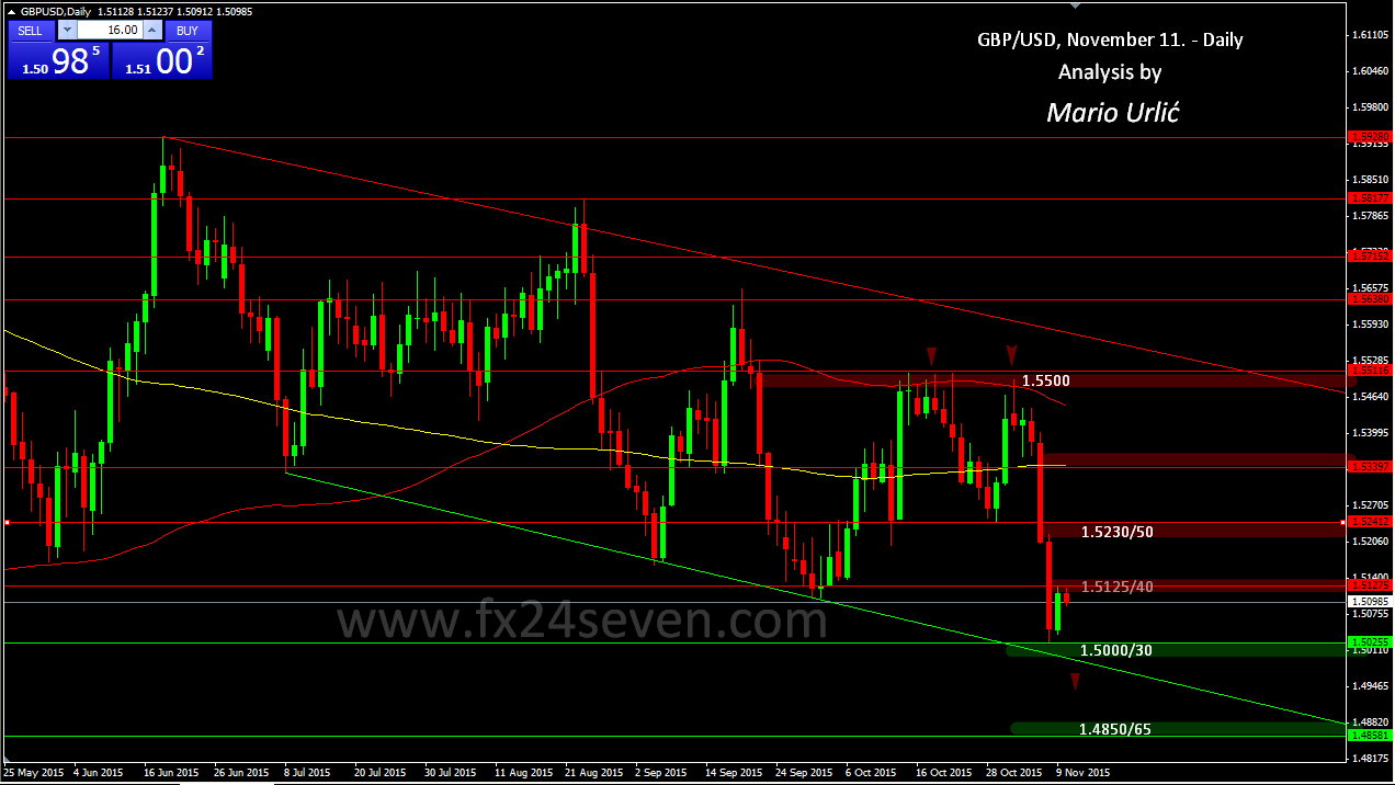 1.5500 and daily MA100 was tough level for the buyers, which I pointed in my previous GBP/USD analysis from October 14., after wich the pair didn’t manage to break that level for days. Last week and the US dollar stenght pull this pair down as well and the pair fell from 1.5500 all the way to 1.5026 low, where the buyers have waited and pushed the pair up to 1.5125 yesterday. The buyers should hold this psychological and technical support at 1.50, otherwise the pair could decline furder toward 1.4850 > 1.4600. On the way up, the first resistance is 1.5125/40, follows 1.5230/50 > daily MA200 and 1.5340/60.