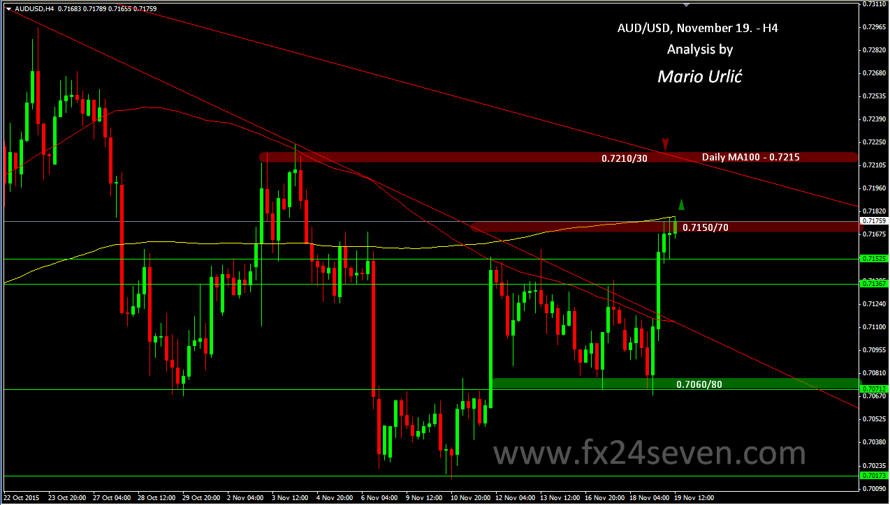 The Aussie bulls have defend a very important 0.7060/80 support yesterday after the FOMC minutes. After the buyers have take over the pair, they have reached down trend line and MA100 until end of the day and during the Asian sesion, they have manage to get true, all the way to my predicted resistance, 0.7150/70. For now, the buyers are trying to pushed the pair up true the resistance level and H4/MA200 and if they manage to do that, possible furder gain is expected. Next target for the bulls could be daily MA100 and strong daily down trend line at 0.7215/30, the strong resistance level as well. Very interesting fight here. On the way back down, 0.7135/50 is the first support, trend line and MA100 second at 0.705/20, stronger one at 0.7060/80 again.