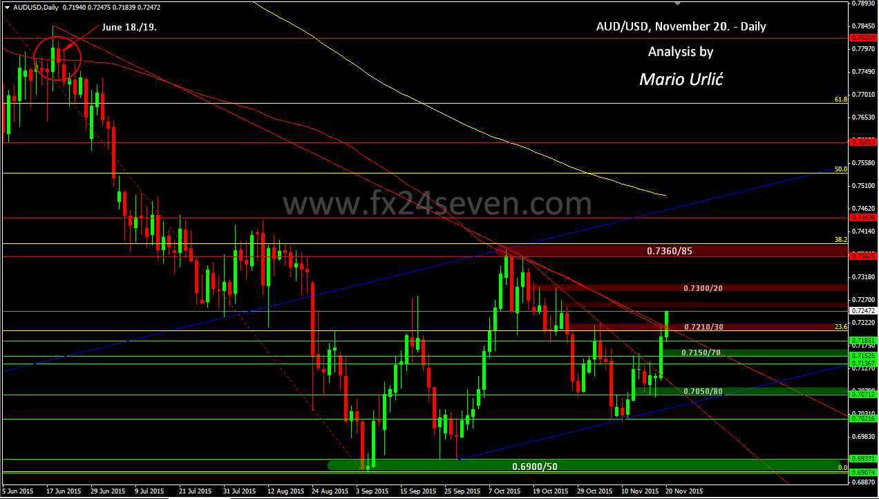 Aussie is breaking resistances one by one and marching forward up strongly in the last two days. If the bulls remain so strong, next target is 0.7300 > 0.7370. Last time, when the Aussie close the day above daily MA100 was June 18., but it didnt’t last long. Could this time daily MA100 provide a solid support on the way back? It’s possible. Sure, closing the day/week above 0.7200 is the first step, after wich the buyers could form a new barrier there in the up coming days. Nice move from the buyers here, despite US dollar strenght today. I was following the pair in this week closely and hope that I have pointed at some important intra-day levels.