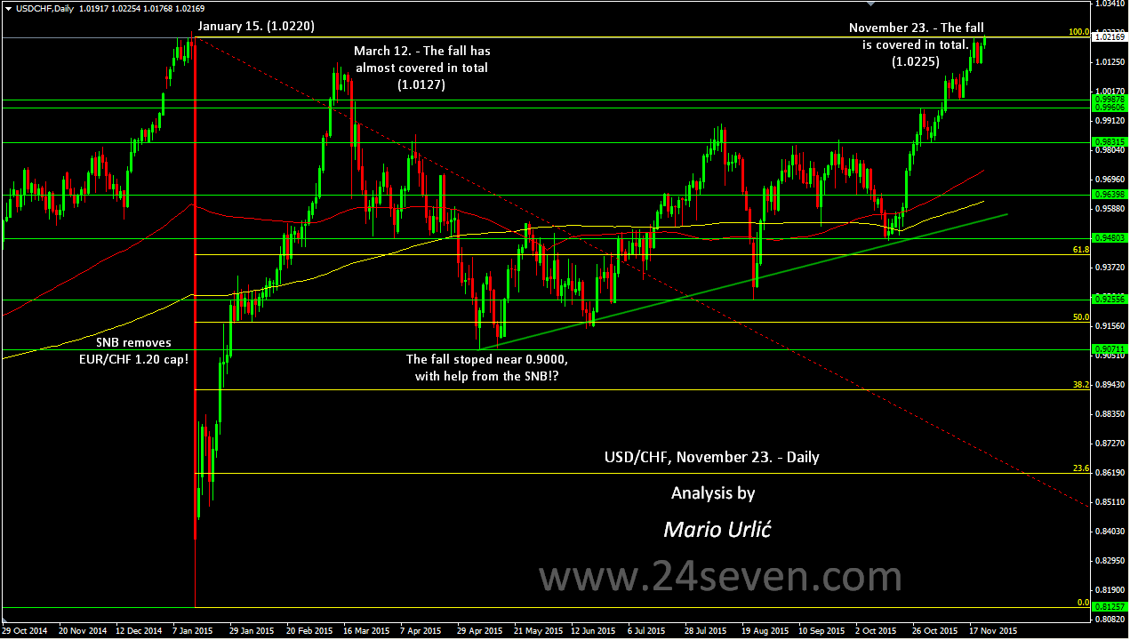 In the last couple of days, the US dollar was near the high level from January 15. (1.0220). That was the day, when the SNB has removed EUR/CHF 1.20 floor and shake the whole FX market, financial world as well. That move caused so many troubles with CHF pairs in the market, but the US dollar start to return the lost teritory immediately and the pair has almost covered everything in the middle of March, with 1.0127 high in March 12. The pair returned down after and fall near 0.9000 in May, after wich the bulls are trying to cover the ‘SNB move’ in total. Finaly, they have manage to cover that today, at November 23., with high of 1.0225. During the year, the US dollar stenght in the market helped this pair to recover and SNB didn’t have to ‘do much’ here, but as I sow it, 0.9000 was the level where they ‘stepped’ in to help. For sure, we will remember the January 15. move for a long time and 2015. when it all happened.