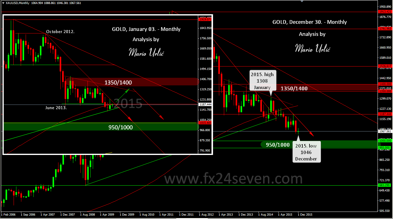 In the beginning of the year, at January 03., I have made a gold analysis and price move prediction for 2015. My predicted price range was in between 1350/1400 on the uper side and 950/1000 on the down side. In my analysis I was pointed for possible bulls attack at first, after wich the bears will take over and push the price down toward 1000 and that was the exact move in 2015. The buyers have pushed the price in January to 1308 and that was the high of the year, after wich the selleres have took over the price and push it down true the year with not much reversal, all the way to 1046 low in December. Gold price was open 2015. at 1160, it will ended at aprox 1067, which shows another bearish year for the precious metal. As I wrote in my analysis from the begininng of the year, I don’t expect for price to be calm as in 2014. where gold price was down for only 1,7% at the end of the year, in 2015. gold price lost 8% of the value. We will see what will happen in 2016., it could be interesting year for the precious metal.