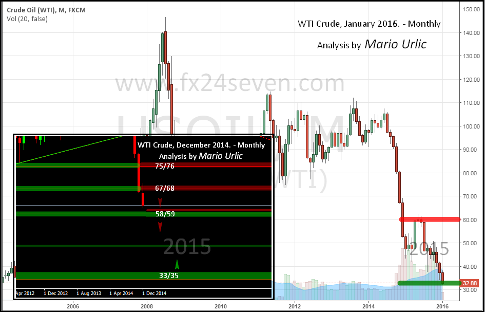 I don’t analyse WTI crude oil often, but at December 10.2014. I have made an analysis and my view for the price in 2015. Quess what, it happend exactly as I predicted. After the WTI crude oil price fall bellow 60 usd, there was no chance for same to recover above, and that level has become strong resistance in 2015. after wich it was just a matter of time when the price will go toward my predicted support level, at 33 usd. As I wrote in my headline in December 2014., “Crude oil is heading to the last support before abyss.” Exactly a year latter, in December 2015., the price fell to 34, where the buyers have stoped the fall and return the price to 38, but in the beginning of the 2016. this level is attacked again and it would be very interesting to see, where the price will go in 2016. My analysis and price projection for the WTI crude in 2015. wasn’t only from the technical side, but from fundamental side as well, based on the global economy and crises caused with high prices from this sector, as one of the most important. What is your view now?