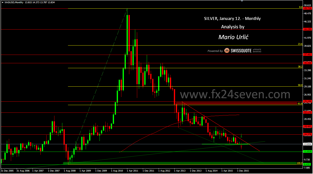 With low at 13.63 in December, silver reached the lowest level since September 2009. But, the bearish trend could continue and the sellers could try to reach the low from 2008. at 8.50/9.00!? On the way down before that, the only stronger support is waiting at 11.80, the low from the beginning of 2009. For now, the silver is holding on support from December last year and up trendline from 2003., but you can see the clear descending triangle in my monthly analysis and if this support level brakes, furder decline could be inevitable. Silver could get the color of rust with return of the levels before recesion and everthing is pointing that this could realy happen in 2016. On the other side, silver must brake this strong monthly down trend line for recovery, there is no other way. What’s your view traders?