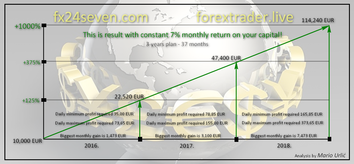 In my presented sample, predicted target is 7% monthly and 37 in a row like that. You can predict different target, 3% or 10% if you want. But, what do you need after and how do it? This is not a strategy, this is only a plan that multiply profits and share it with days spent on the market, showing you the required and possible reached numbers. What you need to do is a proper management for this plan. Take the pen, paper, calculator and write. Make your own strategy on, how much you will risk in one trade, how much pips do you need daily to make a required result? Each one of you will have a different capital in the beggining, I have made this for example only. Make it by yourself. And at the end, when you will have everything done, ready to do it, it will look easy to you. But, as I already wrote, it’s not. It’s far from easy, but it’s much easier then try something this ‘over the night’ to achived.