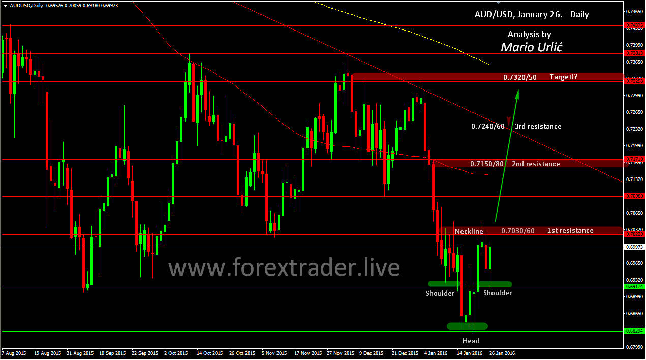 As I see this, it’s possible inverse H&S pattern and 300-350 potential pips in long position. Firts test for the buyers is this necline at 0.7030/60 which they have already tested. If thay manage to brake that, daily MA100 could be the next target and resistance level at 0.7150/80, after wich comes weekly down trend line at 0.7240/60. Take this resistance levels on your mind and be ready to react in time if the sellers take over. Let’s follow and comment here next moves in th up coming days.