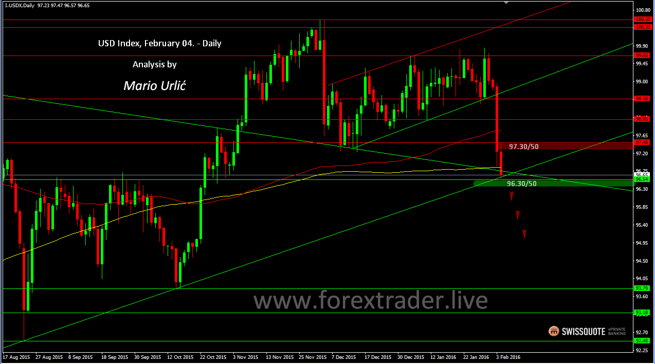 US dollar index have reached 96.30/50, in my point of view very important technical level. Possible break of this support will lead to more loss in the coming period and it will be hard to cover the loss after. For now, the US dollar sellers are serious all over the market, but be aware of this level if you are on the sellers side as well. Daily MA100 was broken yesterday and MA200 has stoped the fall, but as you can see (yellow line), it’s broken today. The US dollar suffers extensive damage in the past two days, which is not strange after unreal strenght during the past 18 months. I wouldn’t stay on the US dollar side.
