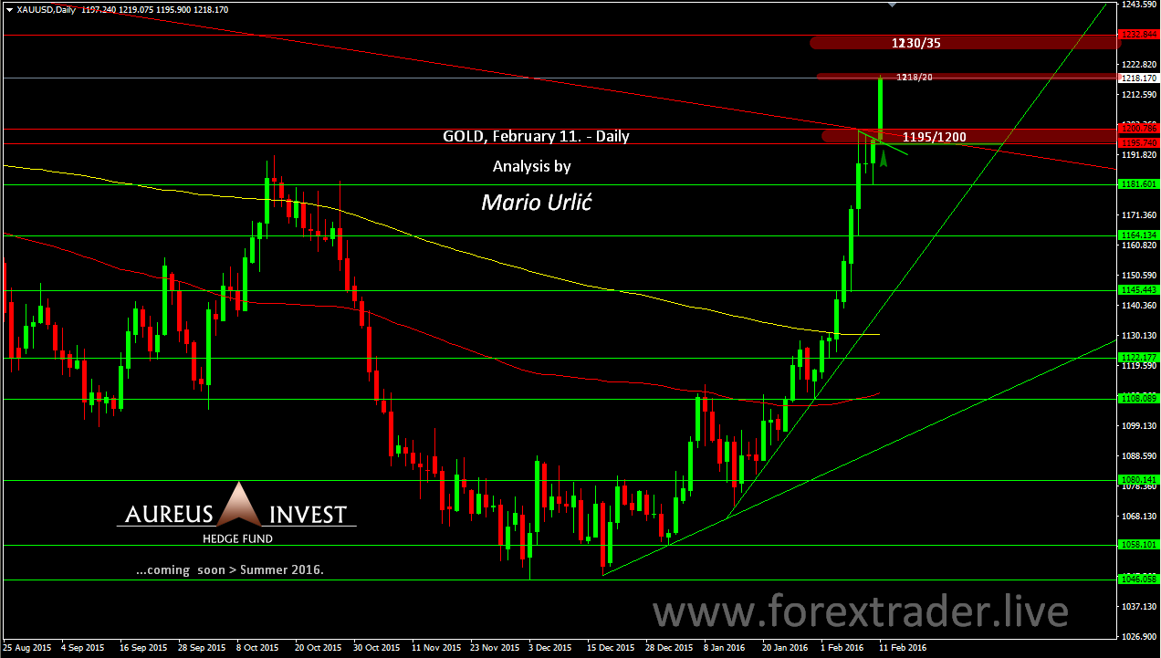 After the gold buyers have reached weekly MA100 and strong resistance at 1195/1200 on February 08., four days latter they have manage to break true the same and reached 1205 at first > 1210 latter during the Asian sesion, after which thay have build the new support at 1205 and continue to push higher in the European sesion, all the way to the next resistance at 1218/20. What they realy want to reach is the next target at 1230/35, but this is already a big step for them, after wich they can build a strong support at 1195/1200 level. Sure, they should close this week above that level first!