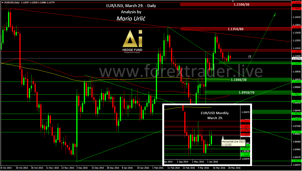 After the pair fell bellow 1.1200 in March 2015., there was no month in wich EUR/USD closed the same above 1.1200/25 and this is the 13th consecutive month in which the pair could also close bellow. You can see that there was several months in wich the buyers have reached higher levels, mostly 1.1500 in 2015., but the sellers are ready and steady all the time, waiting for the optimists. Could we see another try to reach 1.1500 in April? Why not!? Sure, there was so many interesting developments in March, the ECB cut rates, FED didn’t hike the same and despite opposite expectations, the euro is holding extremely well in the market versus the main opponent, the US dollar. Well, there is no central bank decisions in April and that could be chance for the buyers to try this move again, to reach 1.1500. Because, the pair don’t want to go down and what can’t go down, must go up, right!? I see 1.1000/30 and 1.0950/70 as a strong support from this point and it could be place for the huge players if the sellers could rach that at all. Keep this monthly chart in mind and don’t trade intraday based on this analysis and prediction.