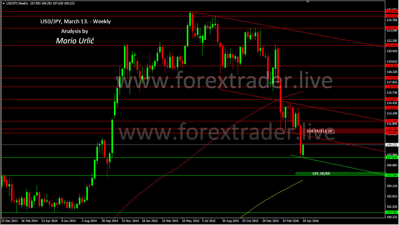 US dollar has find a buyers at 107.60 level last week and in the beginning of the new week in the same level. We could see that this week is in tha favor of the buyers for now in wich they have reached 109.30 today. This is minnor weekly resistance now at 109.30/60, after wich they have a bigger one at the 110.40 level. The strong resistance should begin at the previous support from 110.70, all the way to 111.20. It will be very interesting to see can the buyers reach that level after this huge decline from the last week? In my point of view they will try and they probably could. On the way back down, 107.60 is the place for bigger buyers, bellow that support could be this green trendline toward 105.30/80 level, where the huge players are waiting for possible decline.