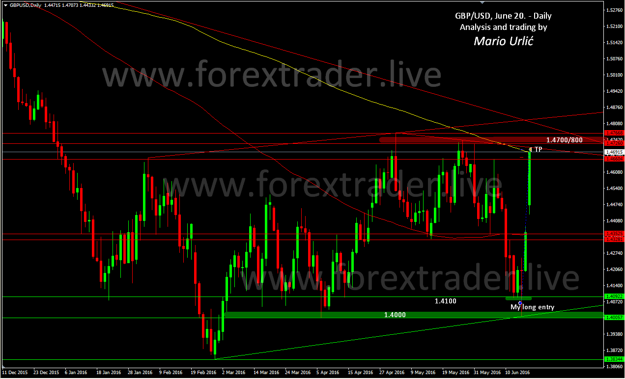 I wrote in my last article that I will try to catch a trade worth to risk in theese days of high volatility and here I am, already out with +633 pips and +55,8K euros trade, after only  three  days! I will try to describe this trade best I can, but as you can see in my chart, I have pointed all the important developments before and after my long entry. On the lower daily chart, you can see better why I have decided to enter long here technicaly and why I have placed my TP here at 1.4700. At first, I have placed my target even higher in between 1.4700/800, but when the price aproached at the resistance level 1.4700 so quickly, three days before the Brexit referendum I’ve decided to move my TP at 1.4700 and watch the furder developments outside the market in this pair.