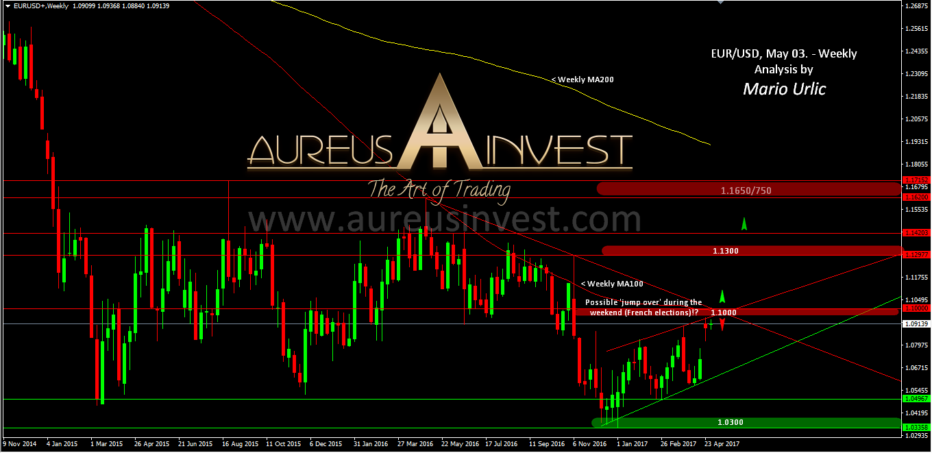 I can’t help myself when I see something interesting and that’s why I want to share this with you. This analysis is our first official technical post as Aureus Invest. Basically, this is how I see this current level in the most interesting currency pair EUR/USD and I can tell that the same is on high importance for furder development here. As you can see, the weekly (red) trend line stoped the pair on the way up for third time last week and now the pair is holding on this level at aprox 1.0920/40 in this one. Weekly MA100 is exactly at 1.1000, just a few pips below and this is the ‘next problem’ for the bulls. But, what’s interesting is that we have the FED and interest rate decision today and what even more important is, the French presidential elections, 2nd round on Sunday May 07. My view is that, if the pair don’t pass this resistance level in this week and it’s hard to expect, we could see a ‘jump over’ due the opening of the next week, of course if Macron, a pro-European centrist win and it should based on recent pools, 60/40 vs LePen.