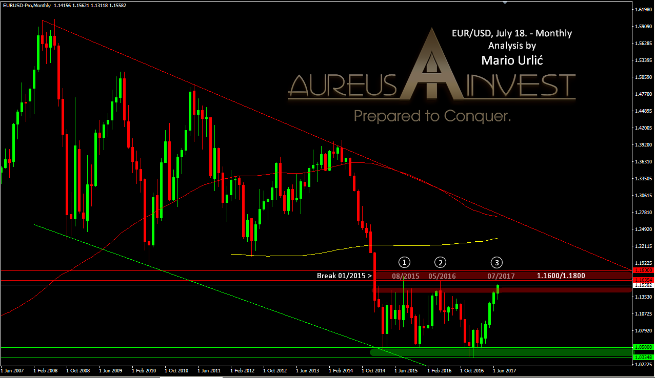Since January 2015, when the EUR/USD broke multy year support at 1.0800/650 the pair didn’t manage to recover above the same and it has spent two and a half years bellow. The buyers have tried to push the pair true that level fot two times, in August 2015 (1.1712 high) and in May 2016 (1.1615 high), but the sellers was simply to strong. After that fails the pair returned to major multy year support at 1.0350/500.
