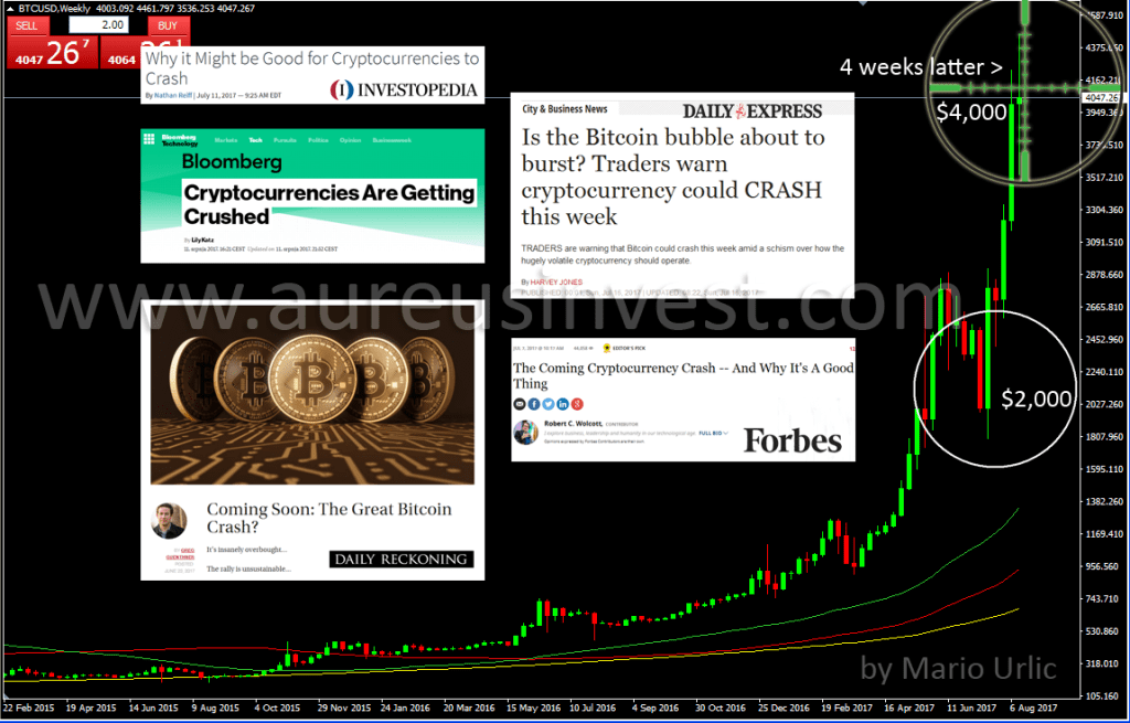 I don’t trade Bitcoin, but I follow the news and developments with crypto currencies preaty much. What was interesting for me in about month ago were the headlines of the possible Bitcoin and other crypto currencies crash in the coming period. Everybody was writing about the same thing, the Bitcoin ‘will crash’ soon. Of course, such a headlines, which were on the top of the news in June/July forced most of the traders to sell the crypto currencies, which caused the additional fall of the Bitcoin from $2,400 to aprox $1,800. Sure, ‘the big boys’ were ready there to fill up their bags and they push the same back and way above the previous high ($3,000) to aprox $4,000. Such a developments are usualy with purpose to make a bigger story from it, so watch it furder. This could be just a beginning.