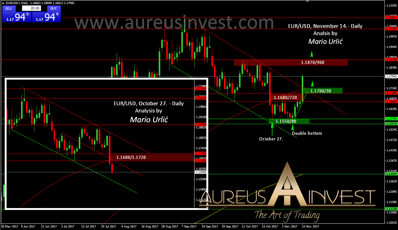 As we wrote and point in our EUR/USD analysis from October 27. the pair has stoped the fall at the support trend line near 1.1550, after which the buyers has formed the strong support line at that level. After October 27. they have tried to push higher, but exactly as we pointed, the sellers helt the resistance line for several times at 1.1680/720. As sellers have took over the pair there, thay have tried to broke the support 1.1550 again on November 07., but the buyers have deffend the line and returned the pair up on resistnace once again. The have formed strong up trendline in the previous 5 days and today finaly broke the resistance level, channel trendline as well. As they have reach 1.1800 today, that could be huge step for the euro and possible sign for furder upward move, first toward 1.1900. As we see, 1.1700/30 could be a strong support level now, if the pair slide back. It’s great to see the euro back, isn’t it!? 🙂