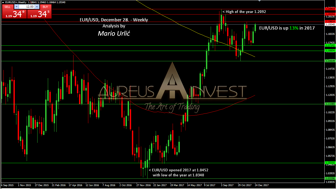 The EUR/USD opened 2017 at 1.0452, with low of the year at 1.0340 at the same week. After buyers have defended that level successfuly, 1.0500 returned as a strong support latter, from which the pair simly flyed to 1.20 level in the comeing weeks. That level was too much for Mr.Draghi and for the ECB and they have done everything that can to lower the euro by the end of the year. As you can see, thay have slightly managed to do that, but the EUR/USD will end the year with 13% gain, near or at the 1.20 despite all the ‘actions’ from the ECB.