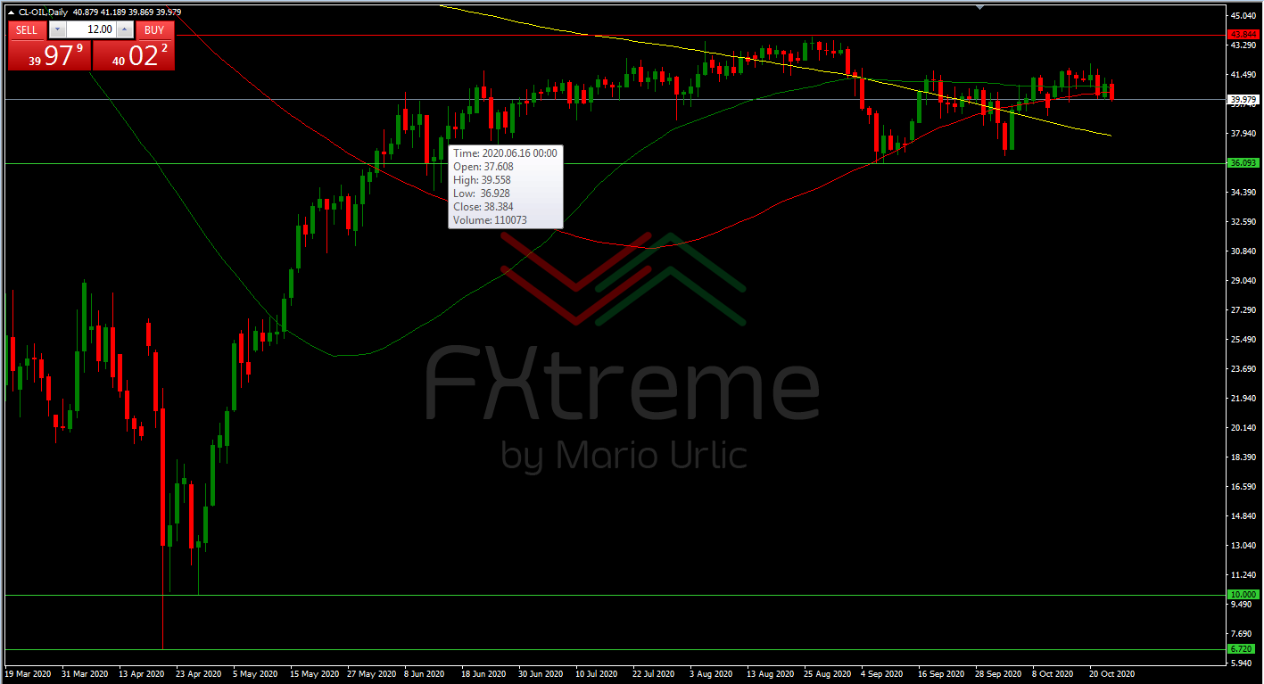 As you can see in daily chart, there is nothing what could help us, technical traders to take the advantage from the patterns. From June and low of $34/35 when I wrote how a see the price still bullish, the price reached the top at aprox. $43 in July/August, after which the low has confirmed at $36 in September/October. That’s all what we can see at the moment. It’s a strange year for the Oil price because of the Covid 19 and all the developments related with, probably it will be more problems furder. OPEC+ is doing a good job with the production cuts, what the Inventories shows clearly from July.